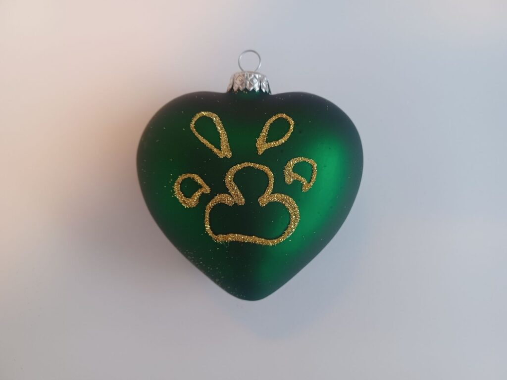 Bombka ma dość spory rozmiar i kształt gładkiego serca w kolorze zielonym. Ozdobiona jest złotą łapką. Ta przepiękna ozdoba stanie się cudownym symbolem na Twojej choince, ukazującym ogromny gest, jaki zrobiłeś w te święta na rzecz zwierząt.