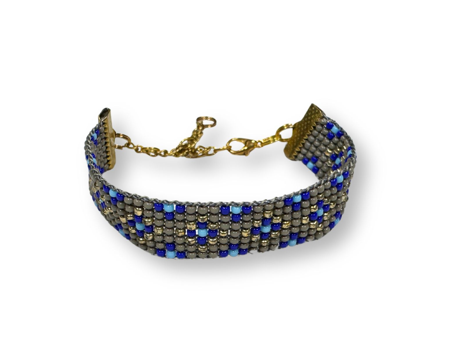 Bransoletka wykonana ze szklanych koralików w kolorach szarości i granatach. Tkana na specjalnej nici, zakończona elementami ze stali chirurgicznej w kolorze złotym. Idealna zarówno do codziennych, jak i eleganckich stylizacji.