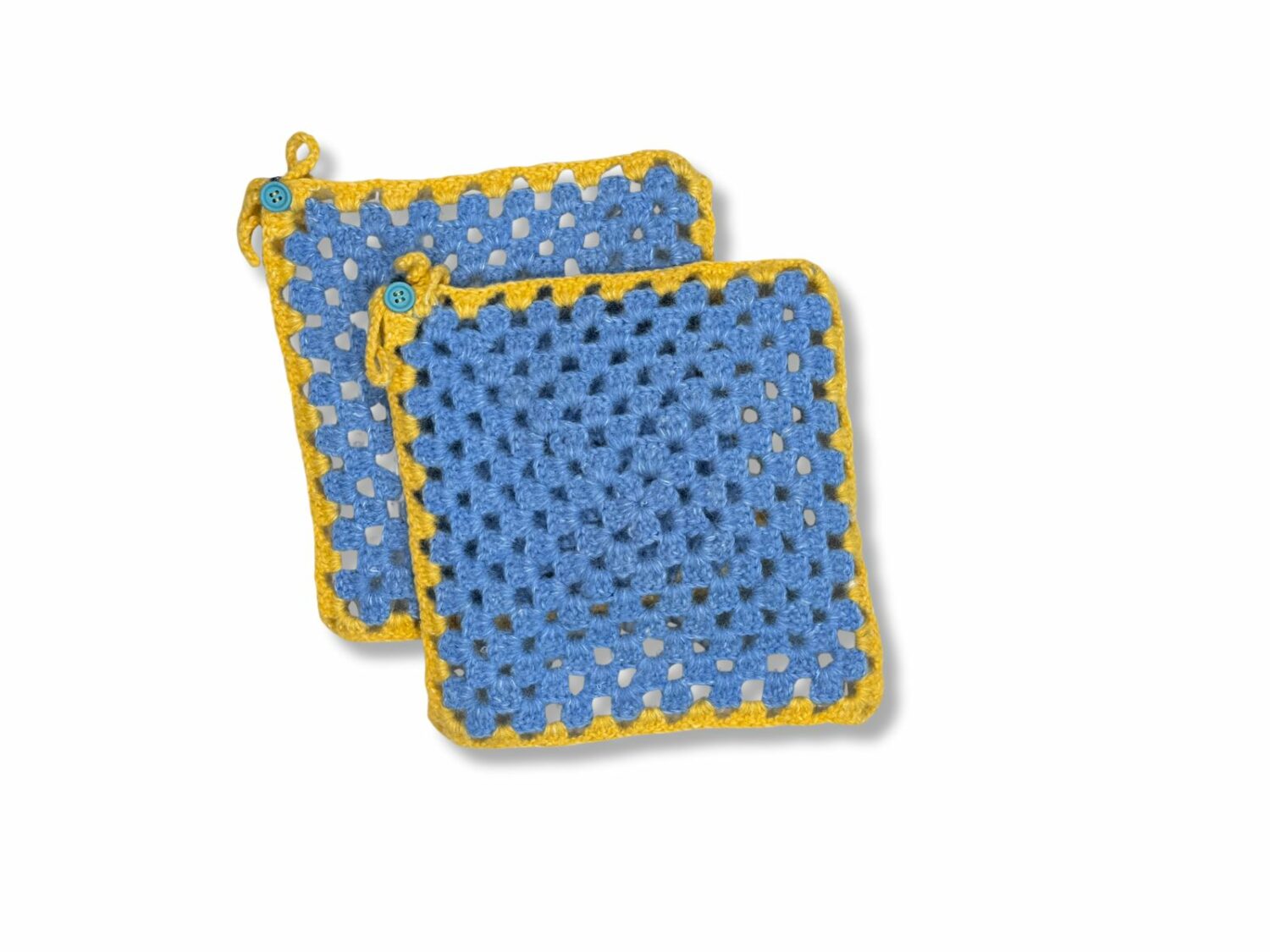 Uchwyt na garnki w kolorze niebiesko-żółtym, wykonany ręcznie. Może być również stosowany jako podkładka pod garnki. Zestaw zawiera dwie sztuki. Łapka wygodna zarówno dla osób prawo-, jak i leworęcznych. Pętelka umożliwia łatwe odwieszenie, gdy nie jest używana.