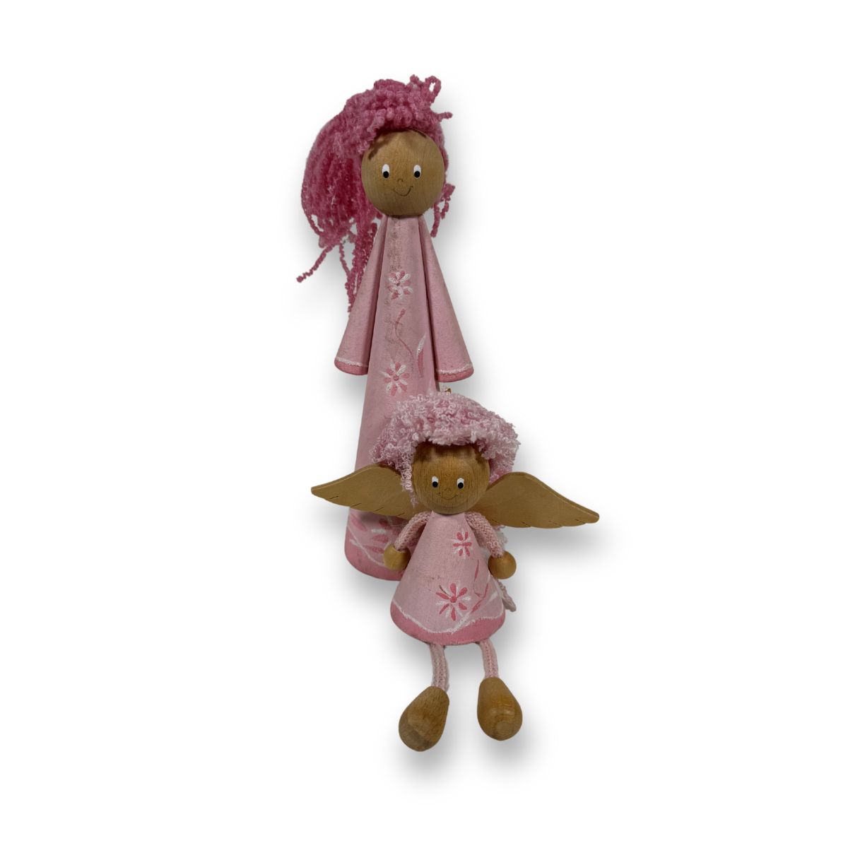 Aniołki wykonane z drewna w kolorze różowym to idealny prezent na chrzest, na nowe mieszkanie lub po prostu jako ozdoba. W zestawie znajdują się dwa aniołki. Mniejszy może posłużyć jako drewniana laleczka.