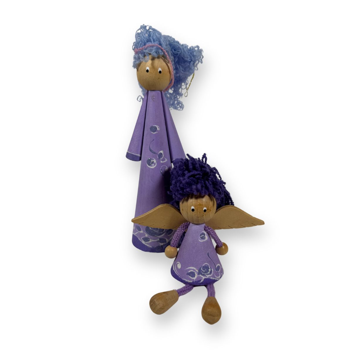 Aniołki wykonane z drewna w kolorze fioletowym to idealny prezent na chrzest, na nowe mieszkanie lub po prostu jako ozdoba. W zestawie znajdują się dwa aniołki. Mniejszy może posłużyć jako drewniana laleczka.