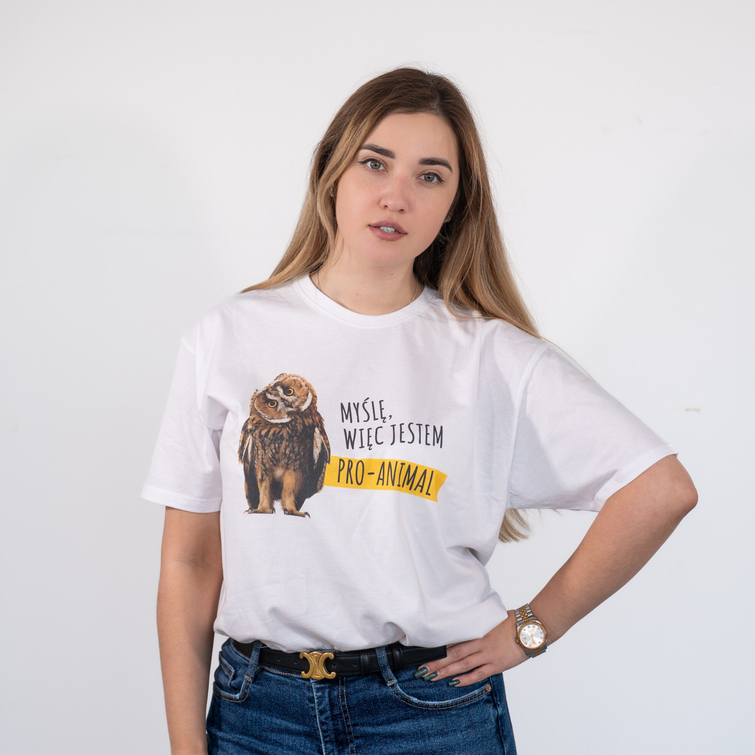 Koszulka bawełniana w kolorze białym z napisem Myślę, więc jestem pro-animal. Posiada uniwersalny, prosty krój.