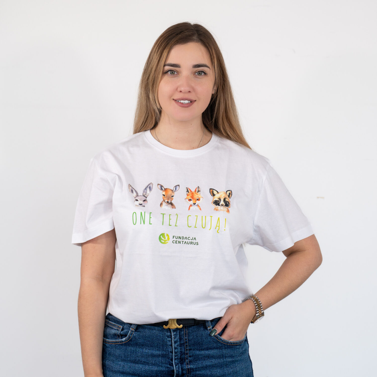 Koszulka bawełniana w kolorze białym z napisem One też czują. Posiada uniwersalny, prosty krój. Koszulki są unisex.