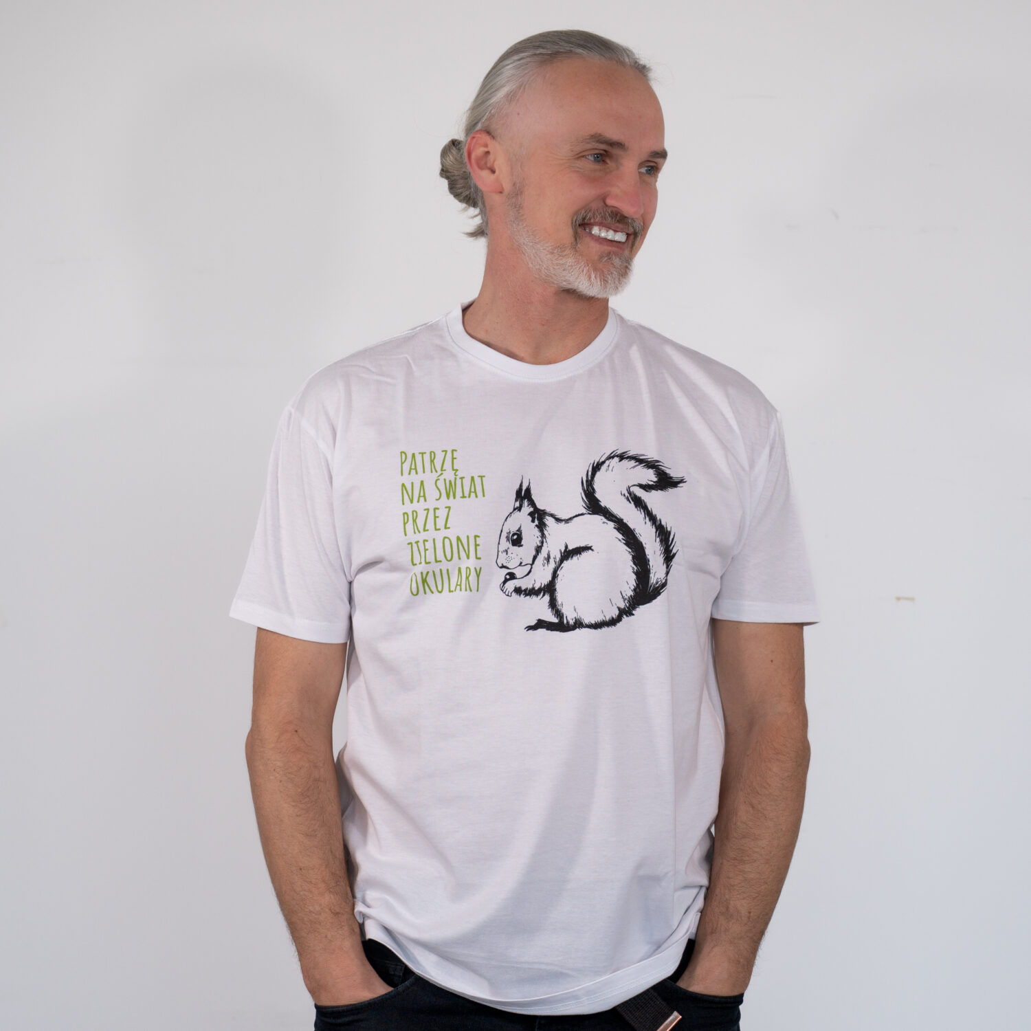 Koszulka bawełniana w kolorze białym z napisem Patrzę na świat przez zielone okulary. Posiada uniwersalny, prosty krój.