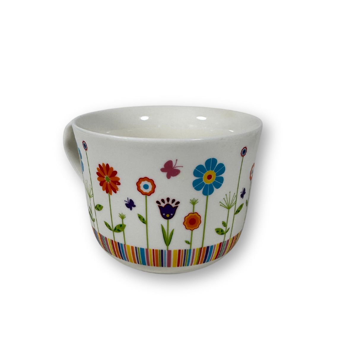 Ceramiczny, biały kubek z pięknym wzorem kwiatów.