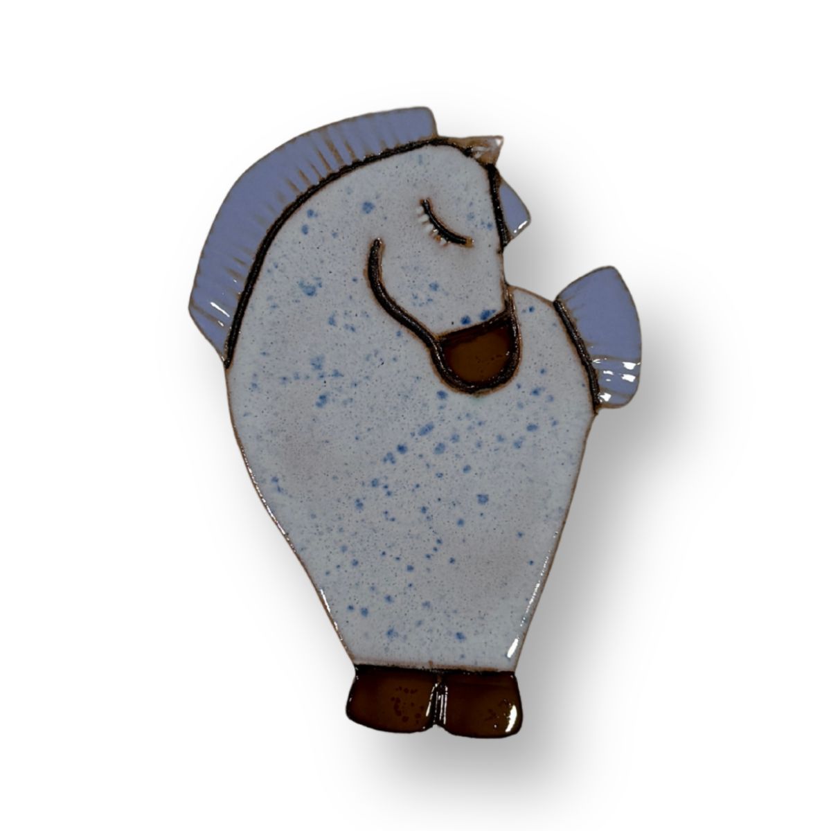 Piękny magnes na lodówkę z motywem konia w kolorze szarym z niebieską grzywą. Może być idealnym prezentem dla każdego miłośnika koni.