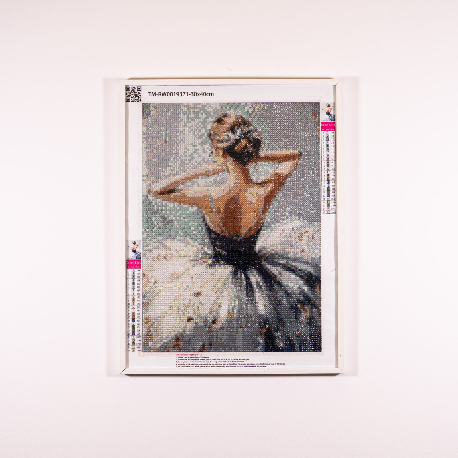 Piękny obraz w białej drewnianej ramie z motywem kobiety. Dzieło zostało wykonane techniką mozaiki diamentowej.
