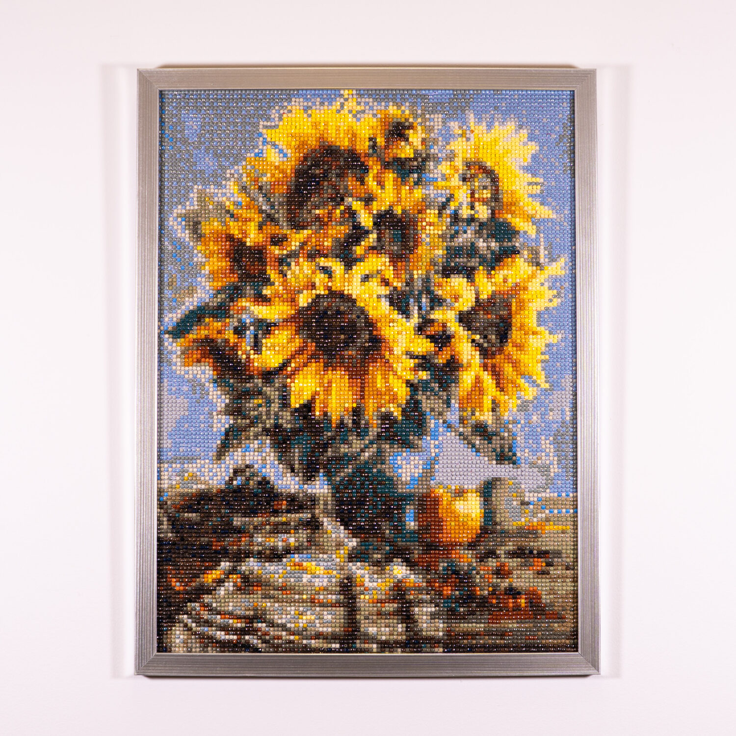 Piękny obraz w srebrnej metalowej ramie z motywem słoneczników. Dzieło zostało wykonane techniką mozaiki diamentowej.