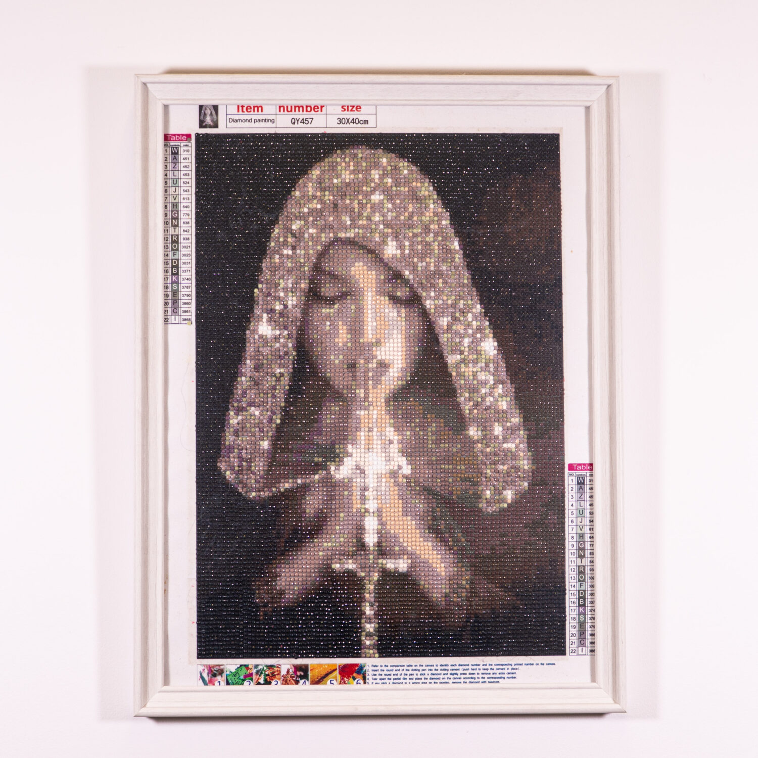 Piękny obraz w drewnianej białej ramie z motywem modlącej się kobiety. Dzieło zostało wykonane techniką mozaiki diamentowej.
