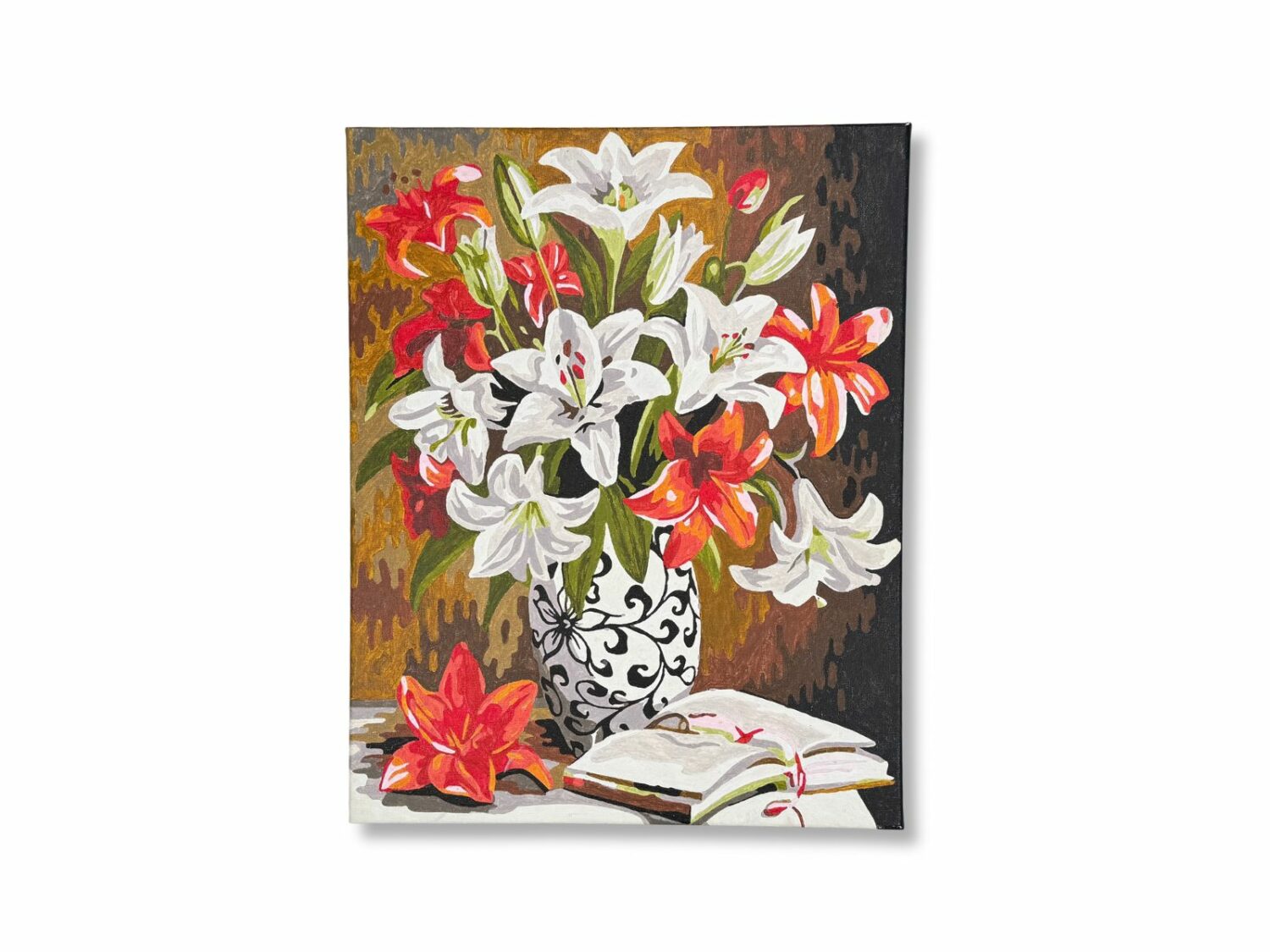 Przepiękny obraz o wymiarach 40×50 cm, przedstawiający motyw kwiatów w wazonie oraz książkę. Ten obraz z pewnością doda uroku każdemu wnętrzu.