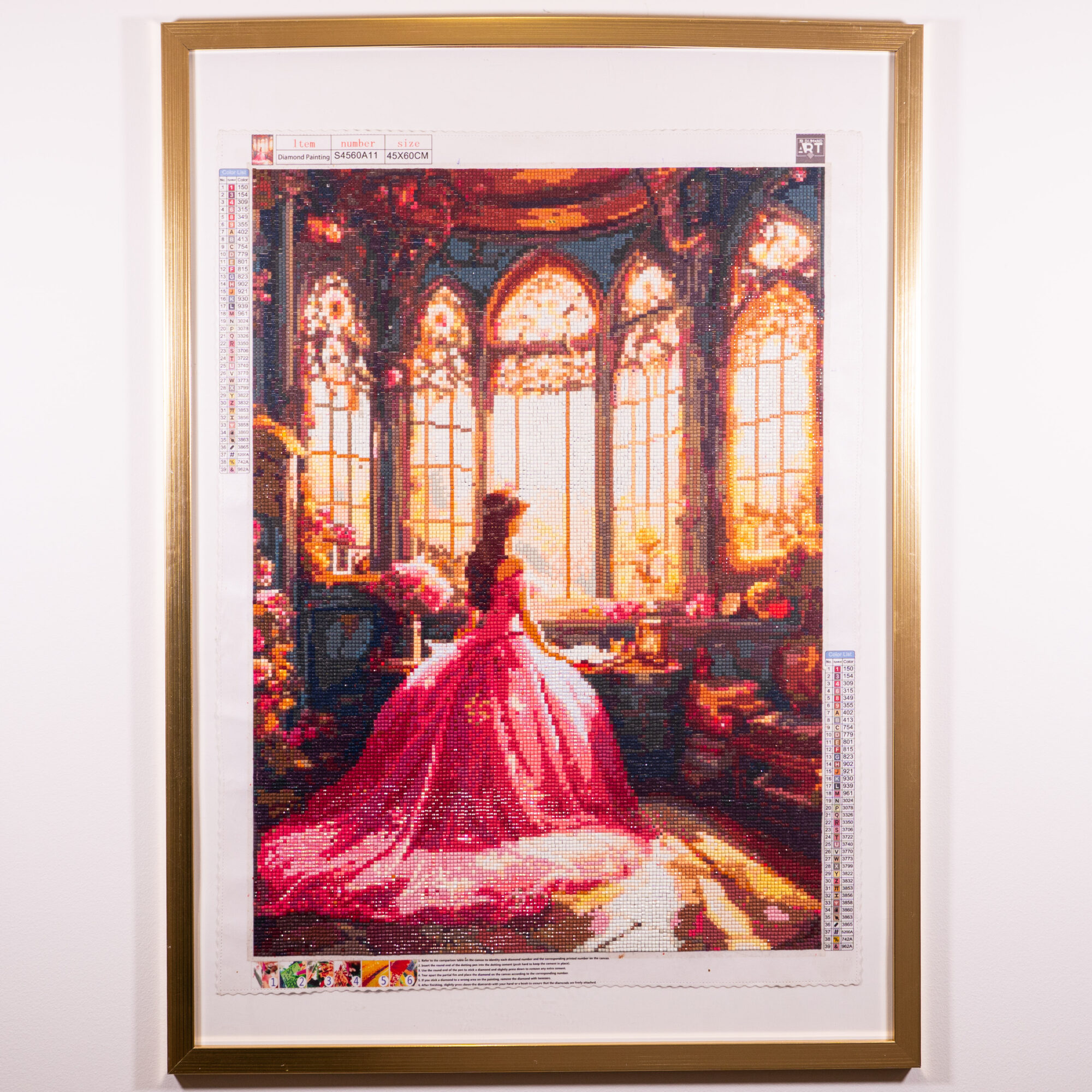 Piękny obraz w złotej ramie z motywem kobiety w sukni balowej stojącej przed oknami. Dzieło zostało wykonane techniką mozaiki diamentowej.