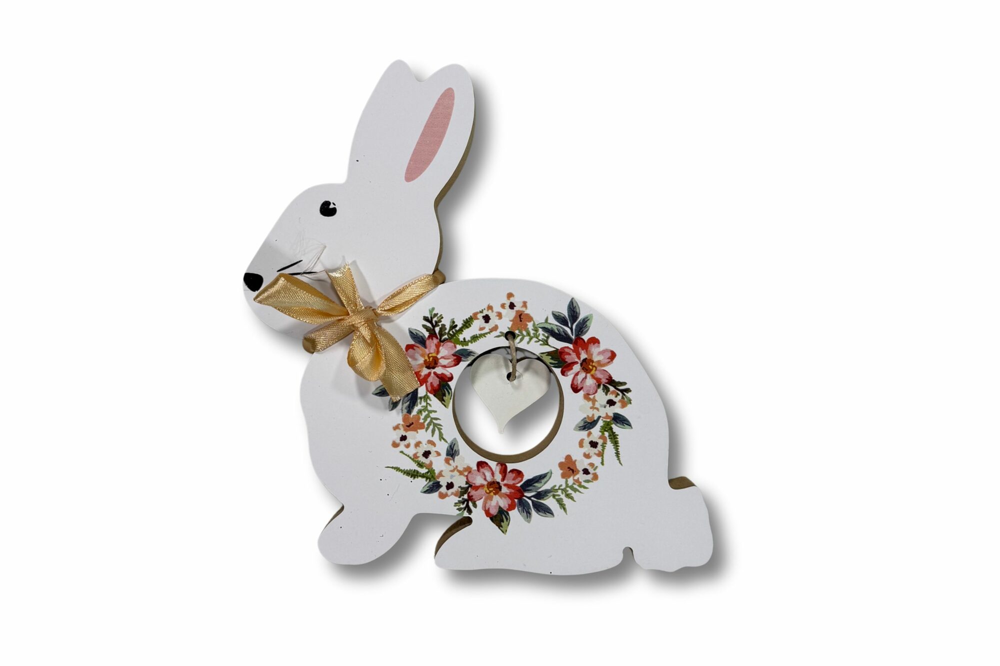 Ozdoba króliczek idealna na stół bądź komodę. Króliczek jest w kolorze białym ze złotą wstążką na szyi oraz motywem kwiatów.