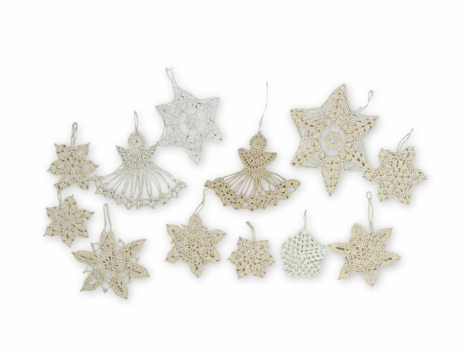 Piękne, ręcznie wykonane ozdoby świąteczne, które można powiesić na choince, a także na oknie lub drzwiach. Zestaw zawiera ozdoby w kształcie aniołków oraz gwiazdek. Ozdoby mogą świetnie sprawdzić się jako dodatek do prezentu.