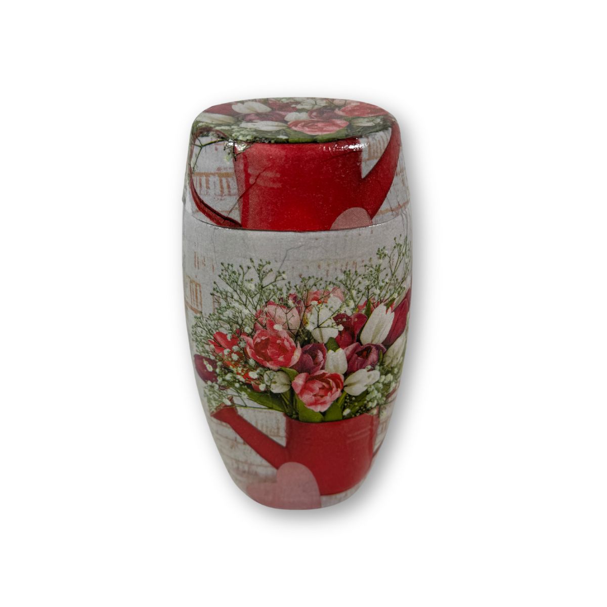 Kreatywna ozdoba, która jest słoikiem po kawie może służyć jako wazon albo dzięki szczelnemu zamknięciu, idealnie nadają się do przechowywania ryżu, makaronu, cukierków, herbaty czy przypraw. Słoik ozdobiony jest okleiną w tulipany.