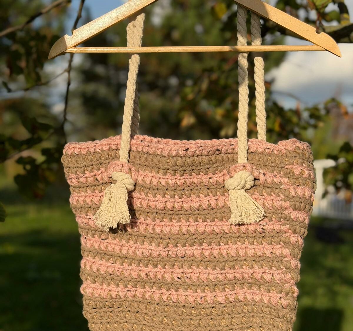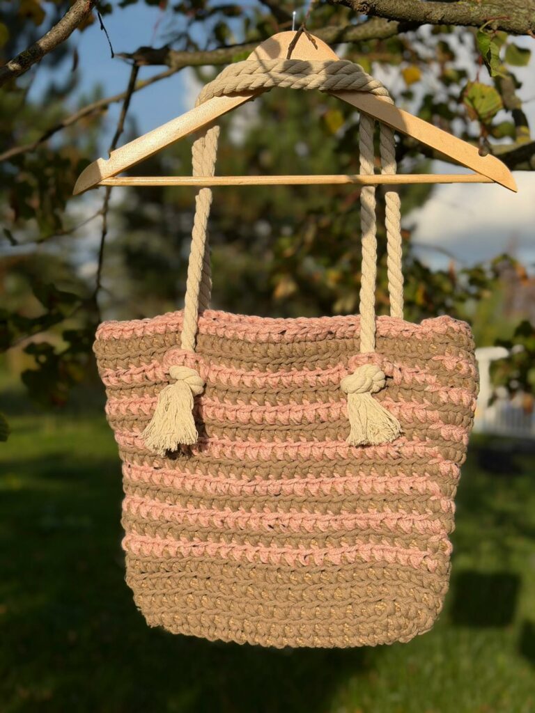 Nasze torby są unikalne, ponieważ powstają ręcznie, co oznacza, że nie istnieją dwa identyczne egzemplarze. Posiadają oryginalny design. Materiał jest wytrzymały i mocny, dzięki czemu torba może służyć przez wiele lat. Jest funkcjonalna, zaprojektowana tak, aby nadawała się na różne okazje, na przykład na zakupy lub na plażę. Torba jest w kolorze beżowo-różowym. Nie posiada zapięcia.